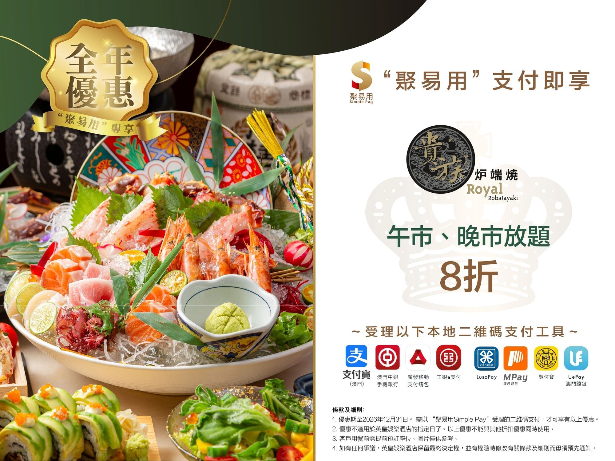 To elevate our patrons’ dining experience, Royal Robatayaki is thrilled to launch year-round discount offer by using “SIMPLE PAY”!